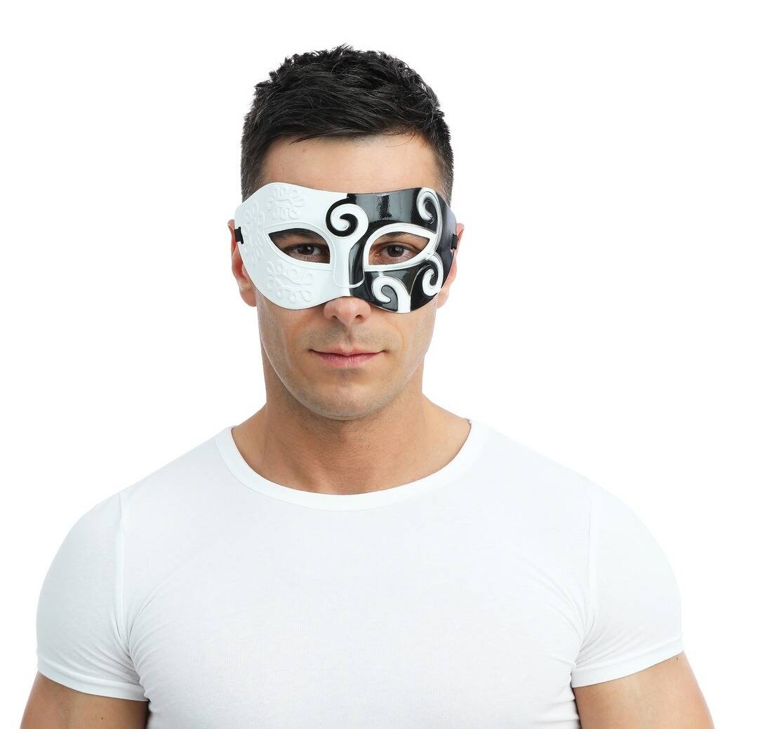 Kaukė pagaminta iš plastiko, užsideda su tampoma gumele. Juodos ir baltos spalvų derinys su dekoratyviais ornamentais suteikia paslaptingumo ir elegancijos.