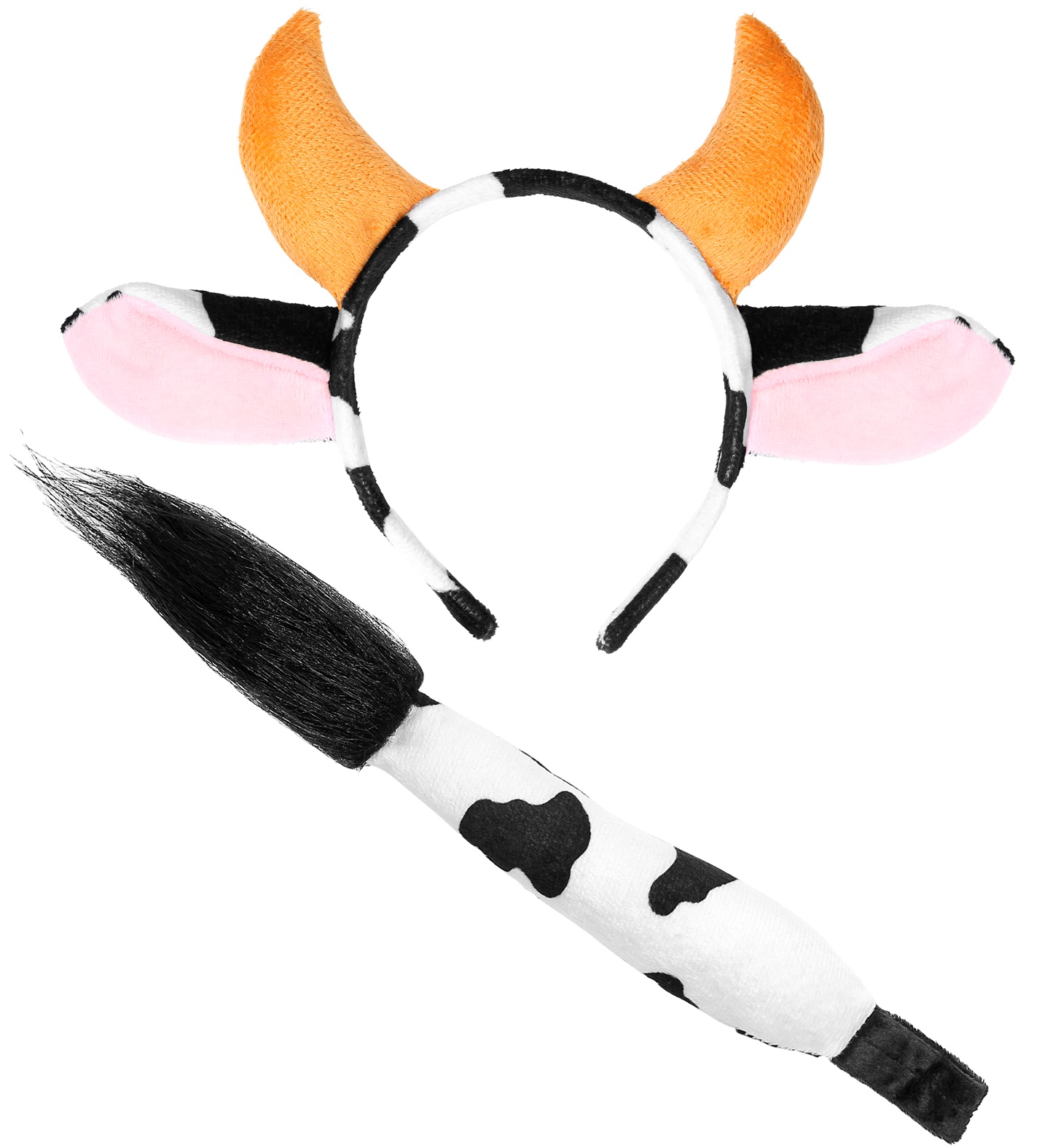Rinkinį sudaro: lankelis su karvės ausytėmis ir juodai balta uodega su pūkuotu galiuku.