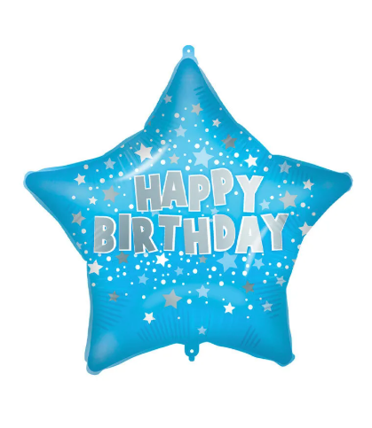 Folinis balionas "Happy Birthday", mėlynas, žvaigždės formos, puikiai tiks vakarėliams papuošti.