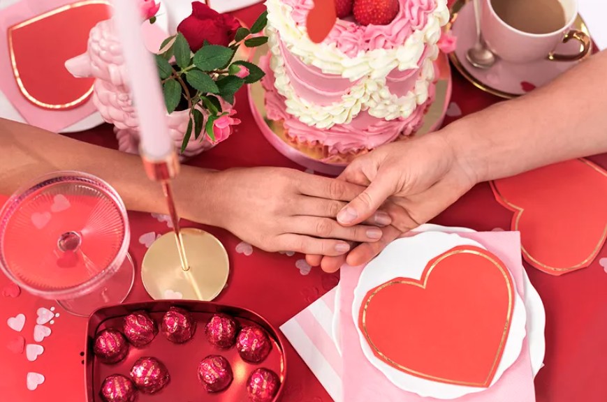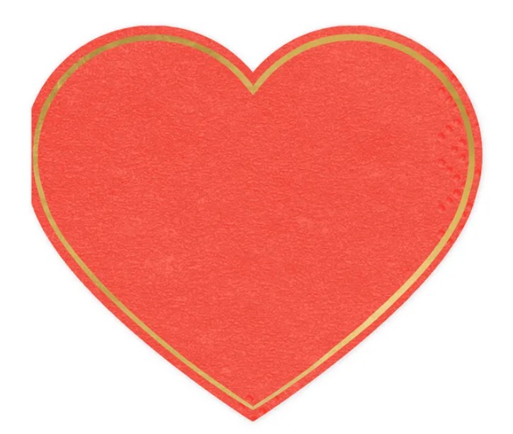 Raudonos spalvos, širdelės formos servetėlės su auksinėmis detalėmis - stilingas pasirinkimas Valentino dienos vakarėliui.