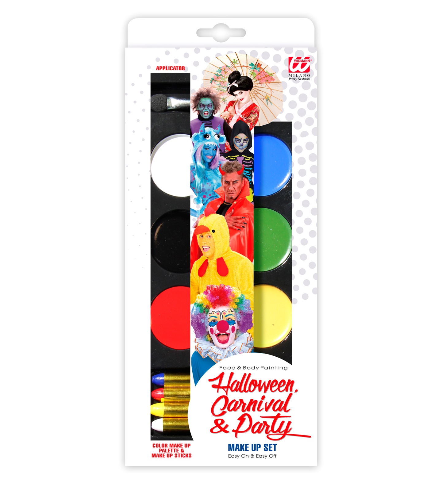Grimo spalvos: balta, mėlyna, juoda, žalia, raudona ir geltona. Kosmetinių pieštukų spalvos: balta, geltona, mėlyną ir raudona.