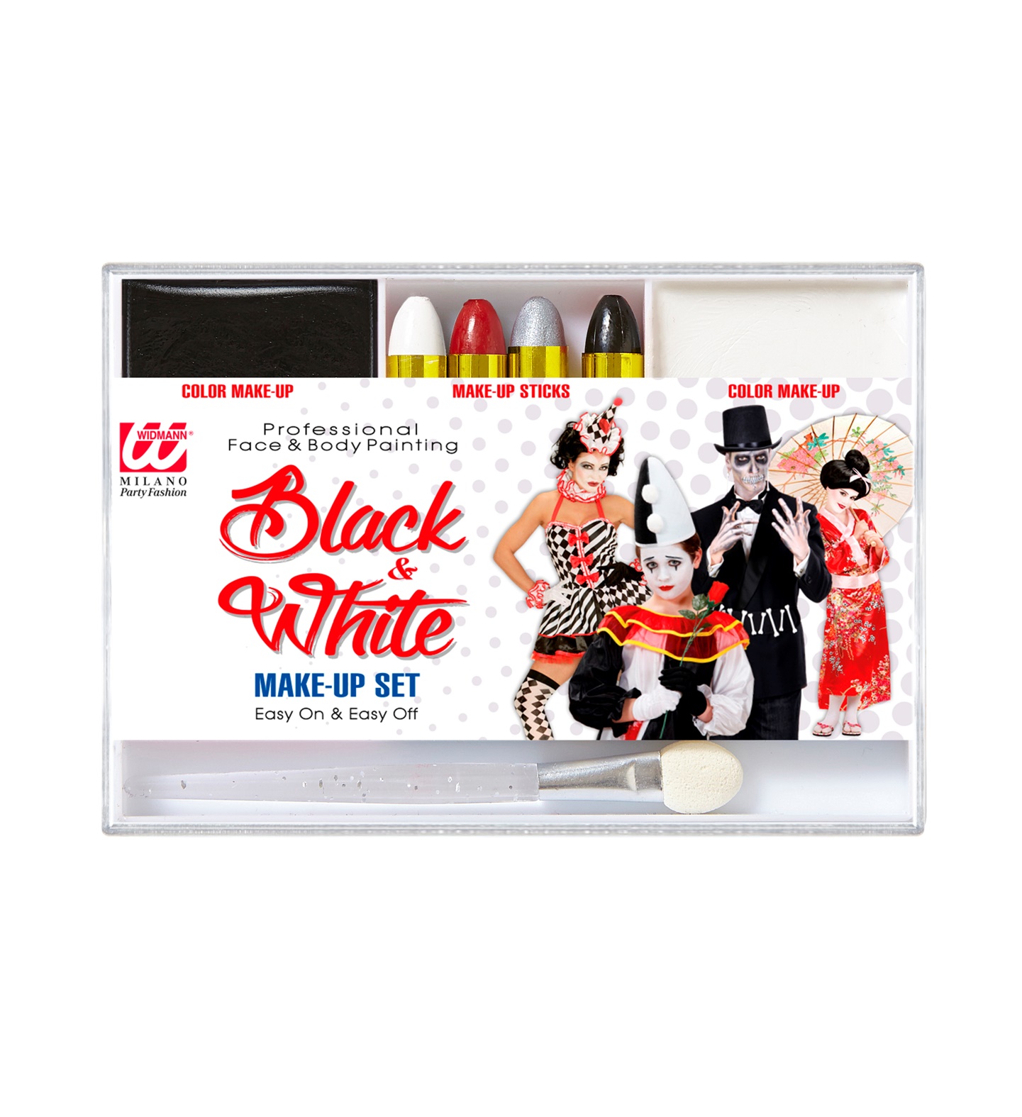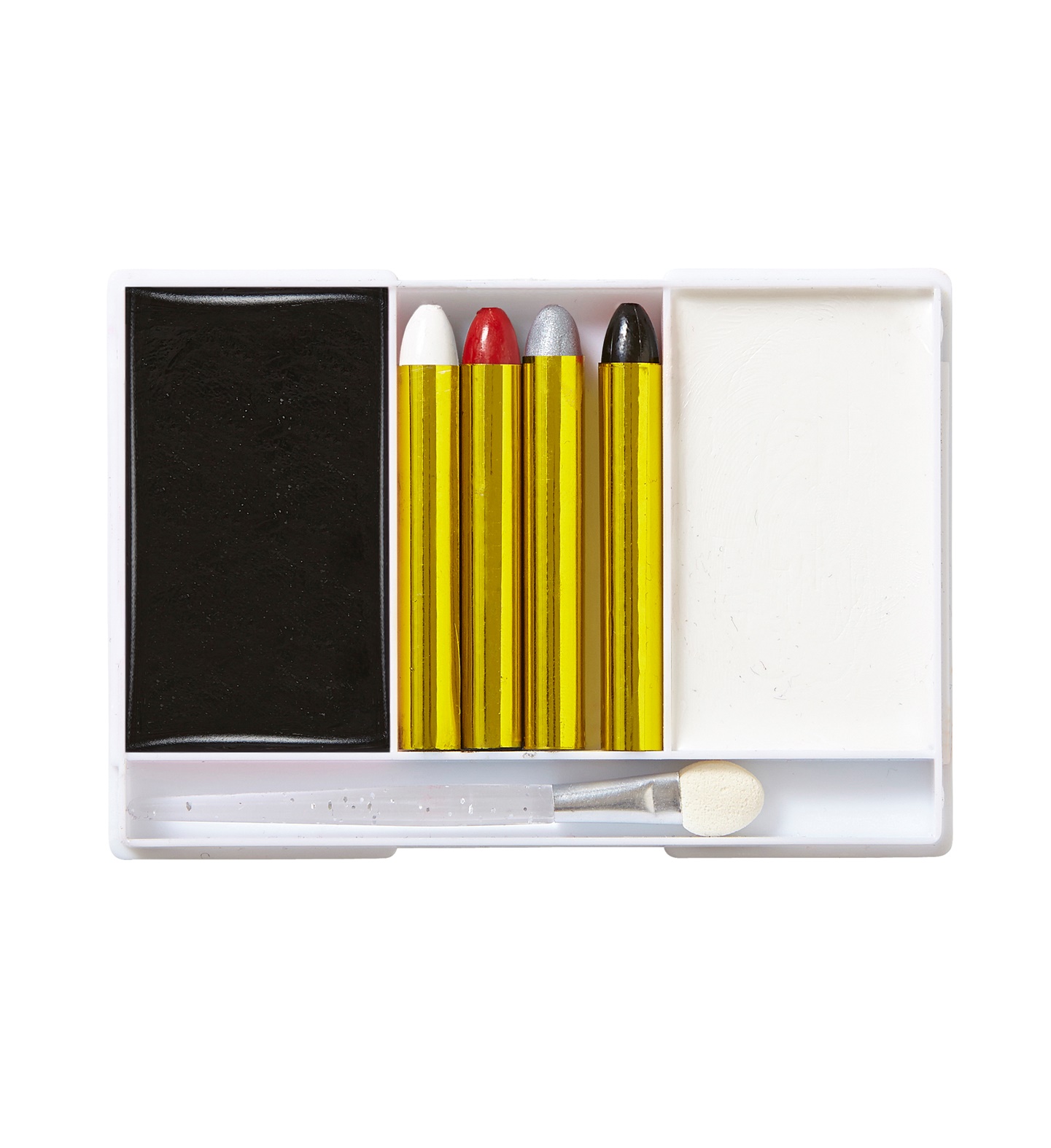 Rinkinį sudaro įvairiaspalviai, aukštos kokybės, minkšti, keturių spalvų grimo pieštukai, baltos ir juodos spalvos grimas paletėje ir teptukas.
