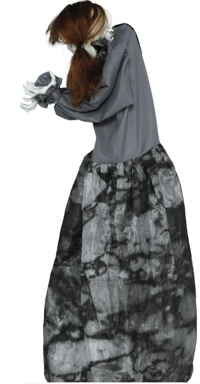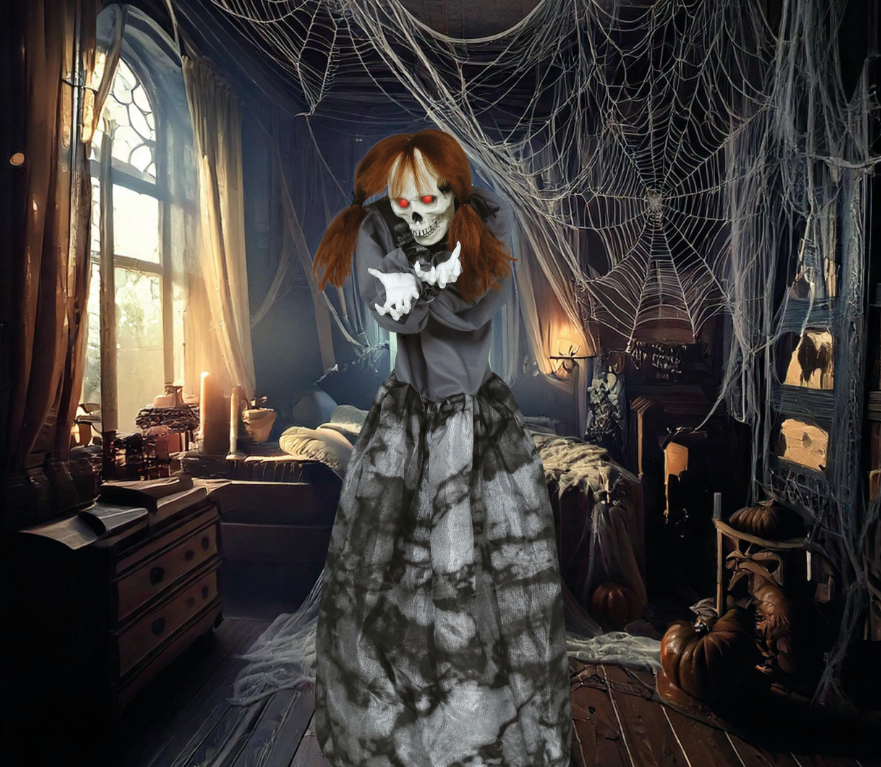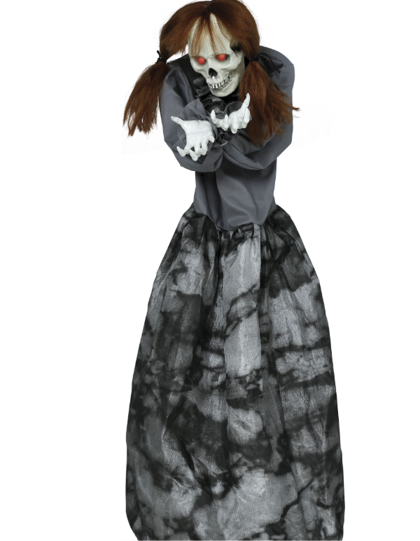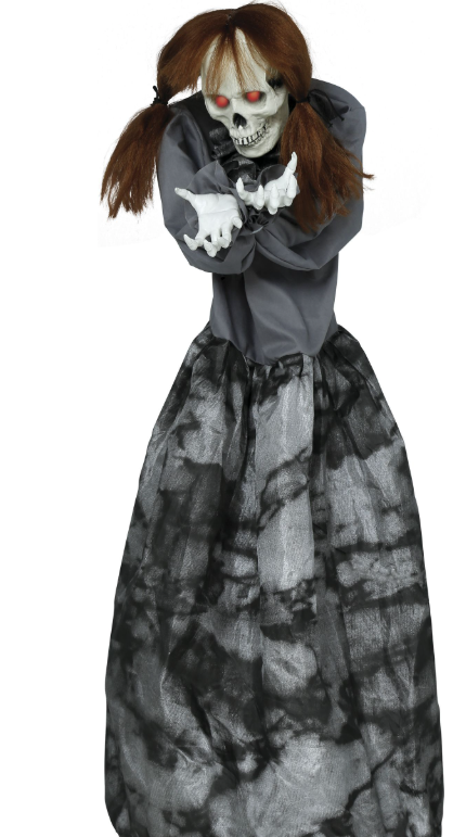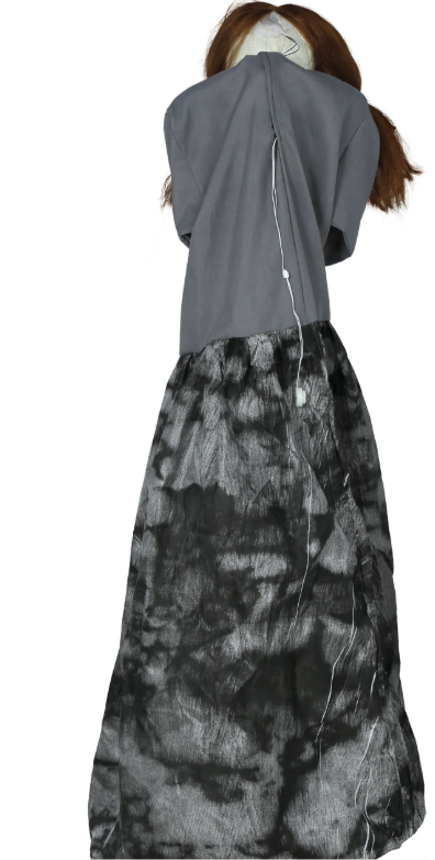 Interaktyvi dekoracija Išmaldos prašytoja tai šiurpi lėlė–skeletas, vilkinti ilgą, tamsų apsiaustą. Jos liesos, kaulėtos rankos ištęstos pirmyn, lyg maldautų pagalbos arba bandytų jus pasiekti. Ant veido – balta kaukolė su pabrėžtais dantimis, o akys švyti ryškiai raudona šviesa, sustiprinančia šiurpią atmosferą.