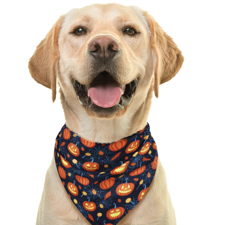 Juoda kaklaskarė augintiniui Moliūgai, su oranžiniais moliūgų paveiksliukais. Tinka įvairiaus dydžio šunims ir katėms.