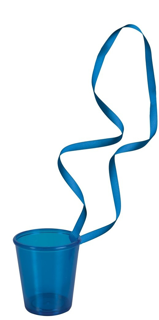 Plastikiniai kaklo pakabukai-stiklinaitės mėlynos spalvos.