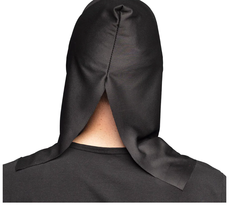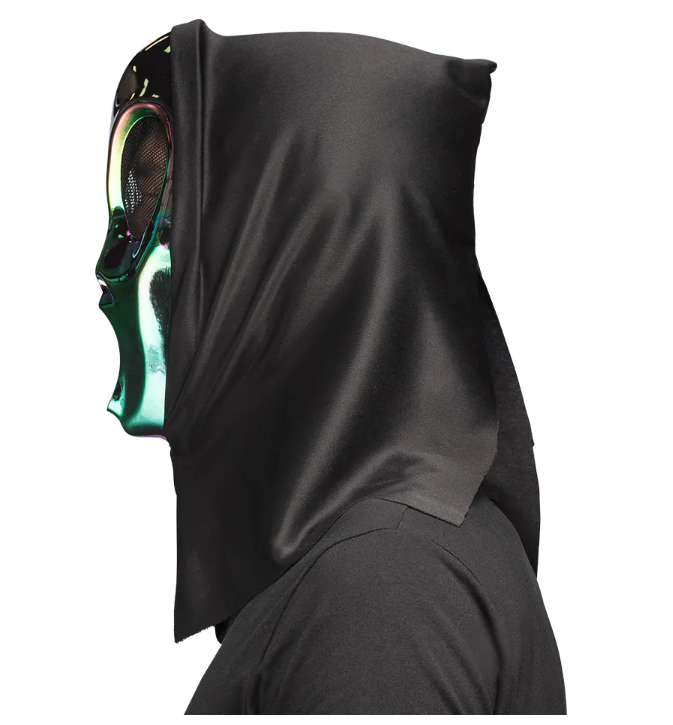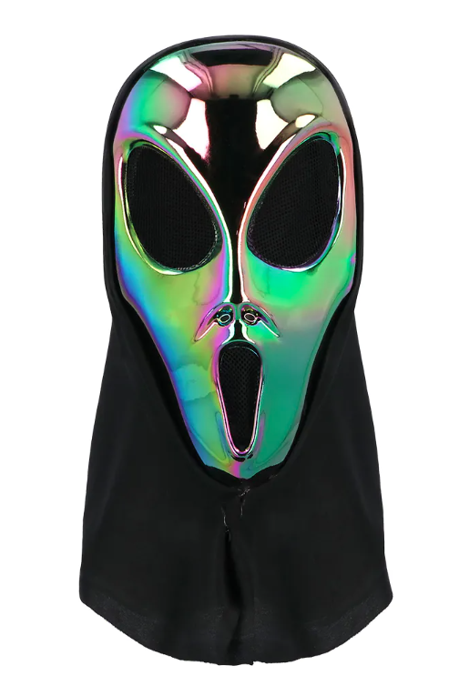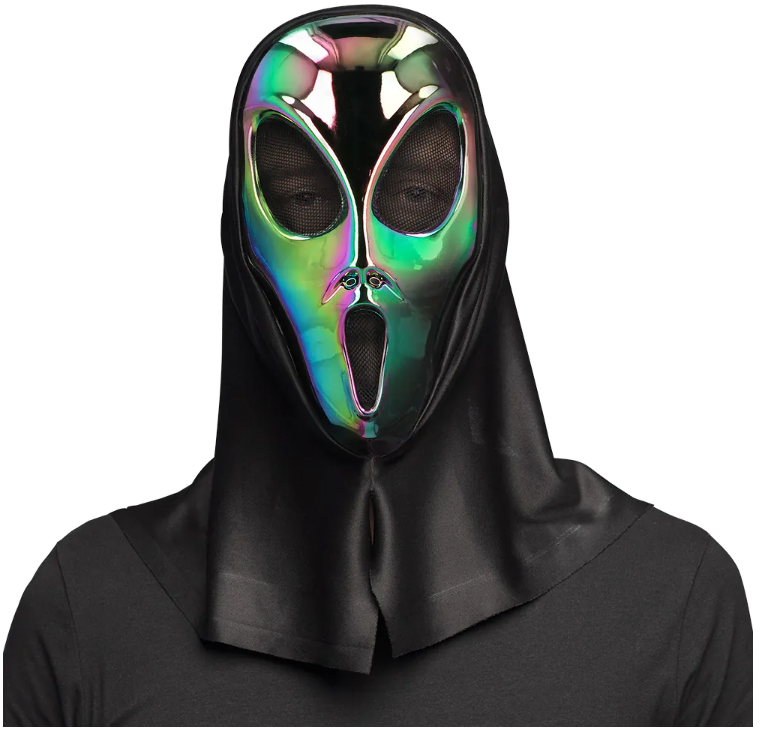 Plastikinė, holografinė ateivio kaukė su juodu gobtuvu.