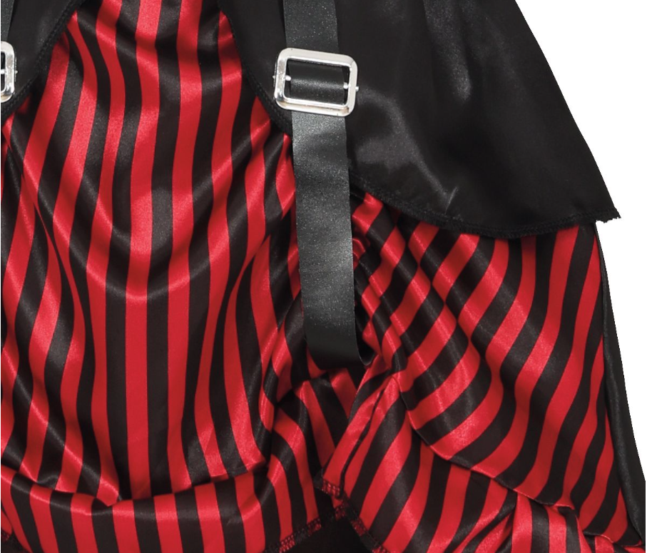 Juodai raudona suknelė su vertikaliomis juostomis. Priekyje esantis trumpesnis, o nugaroje ilgesnis sijonas suteikia ypatingo žavesio. Viršutinė dalis dekoruota juodais diržais su sidabrinės spalvos sagtimis, kurios primena korseto stilių. Ilgos juodos rankovės suteikia kostiumui paslaptingumo.