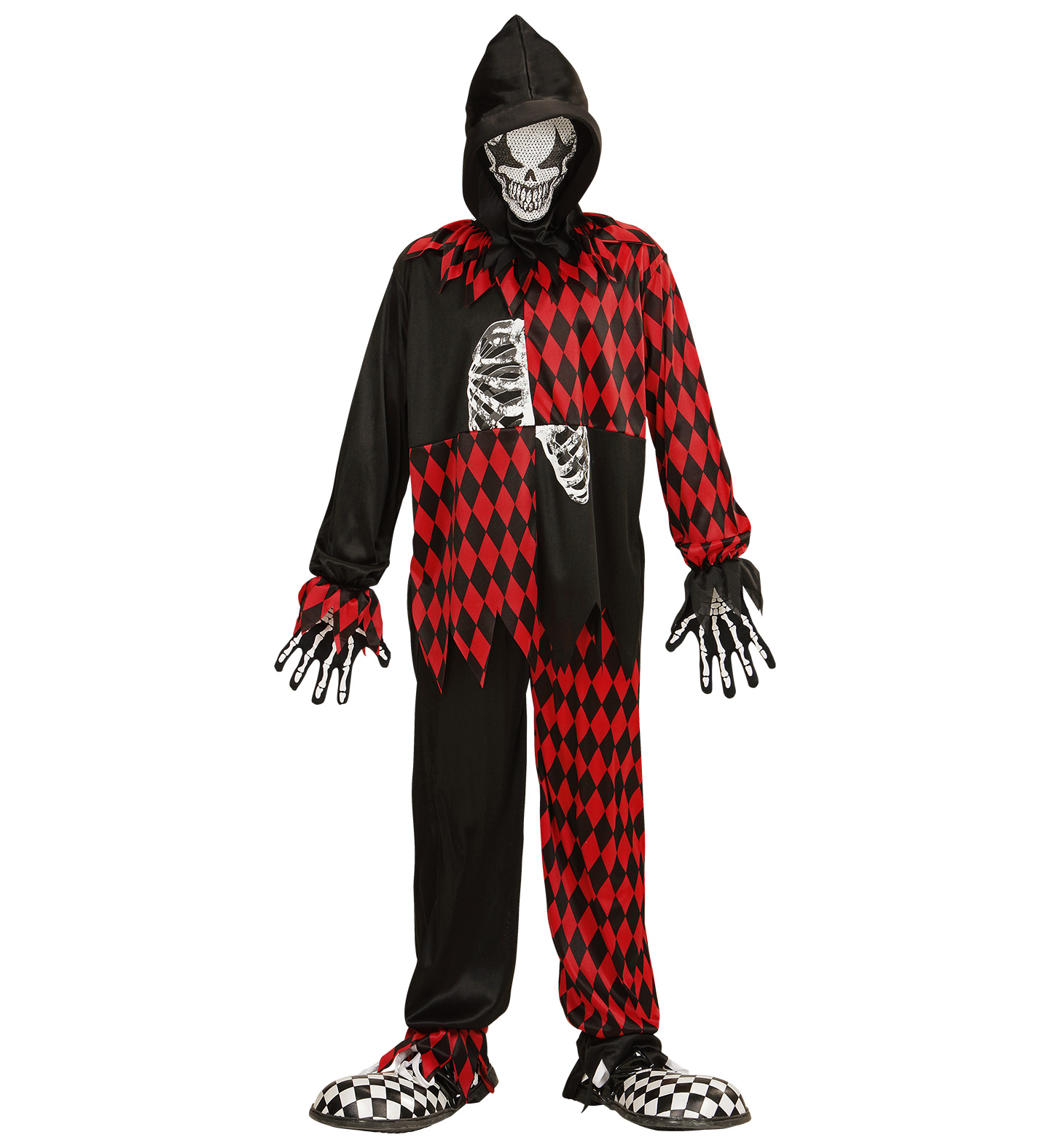 Kostiumas Juokdarys blogietis - kostiumas dekoruotas klasikiniais raudonais ir juodais rombais, kurie iš karto patraukia dėmesį, o nelygūs audinio kraštai suteikia jam sudraskyto, paslaptingo įvaizdžio. Viršutinėje dalyje pavaizduoti griaučių elementai, kurie dar labiau sustiprina baugią atmosferą. Kostiumą papildo gobtuvas su kaukole, suteikiantis visam įvaizdžiui grėsmingą charakterį.