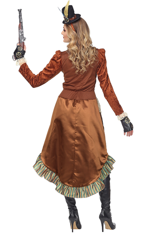 Steampunk Lady kostiumas, kurį sudaro: rudos spalvos suknelė; pirštinės su Steampunk motyvais; juodos spalvos cilindras dekoruotas plunksnomis.