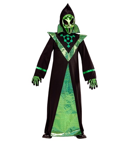 Žaismingas kostiumas Ateivis - plonos malonios medžiagos apsiaustas su gobtuvu, blizgiomis detalėmis ir žalios spalvos kaukė.
