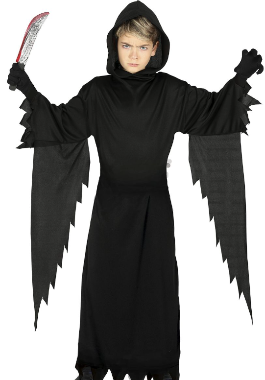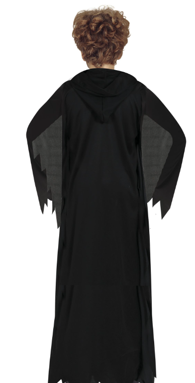 Žudiko kostiumas juodos spalvos, apsiaustas ilgas su plačiomis karpytomis rankovėmis bei gobtuvu.