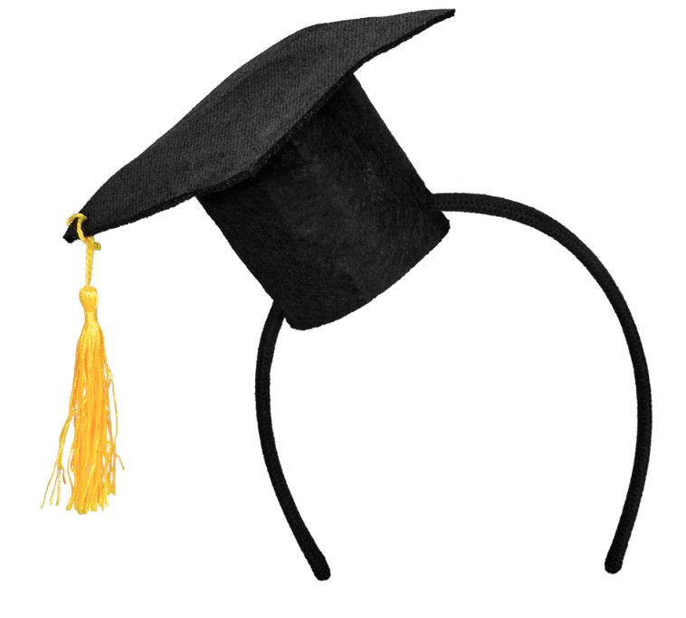 Tvirtos medžiagos lankelis su juoda universiteto absolvento kepure dekoruota geltonais kutais.