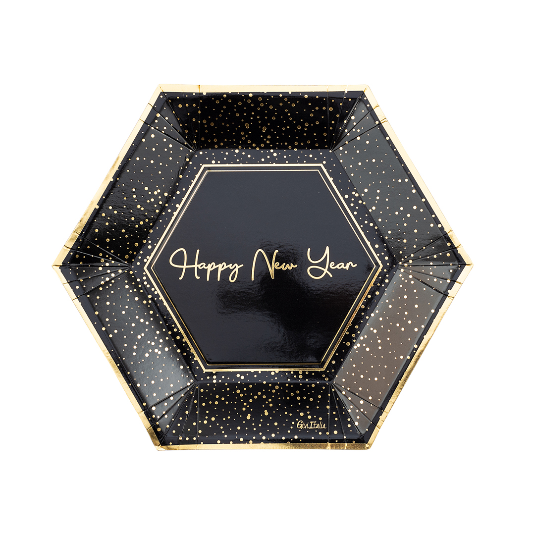 Popierinės juodos lėkštutės su užrašu Happy New Year ir auksiniais taškeliais.
