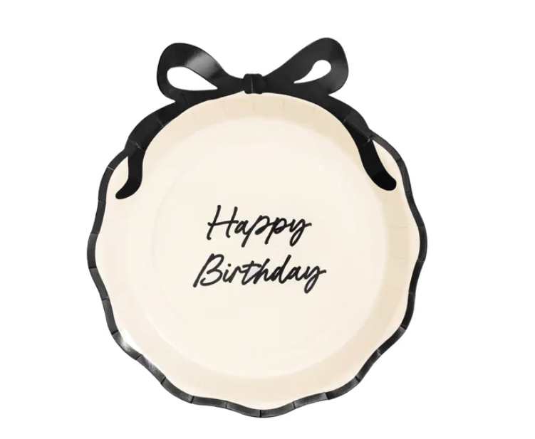 Popierinės lėkštutės dekoruotos juodu kaspinėlių ir užrašu Happy birthday. Lėkštės skirtos tiek karštiems, tiek šaltiems užkandžiams.