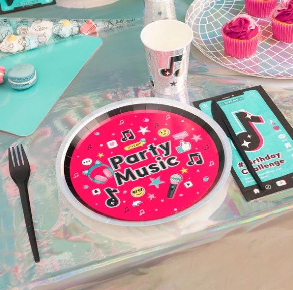 Unikalios popierinės lėkštutės su užrašu Party Music.
