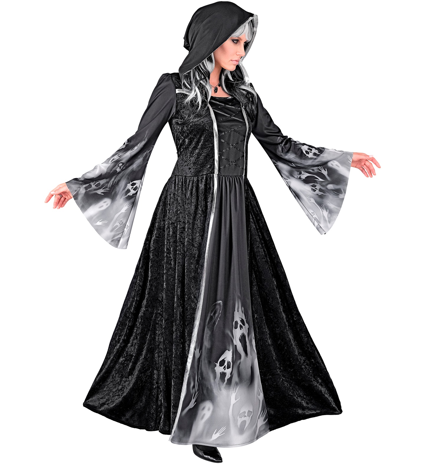 Ilga, juodos spalvos suknelė su kapišonu ir plačiomis rankovėmis, paslaptingais pilkais ornamentais, primenančiais iš tamsos išnirusių klykiančių dvasių veidus, sukuria šiurpą keliančią, bet kartu elegantišką išvaizdą. Priekyje esantys korseto tipo raišteliai suteikia suknelės siluetui dailumo, o priglundanti viršutinė dalis kontrastuoja su plačia, žemę siekiančia apačia.