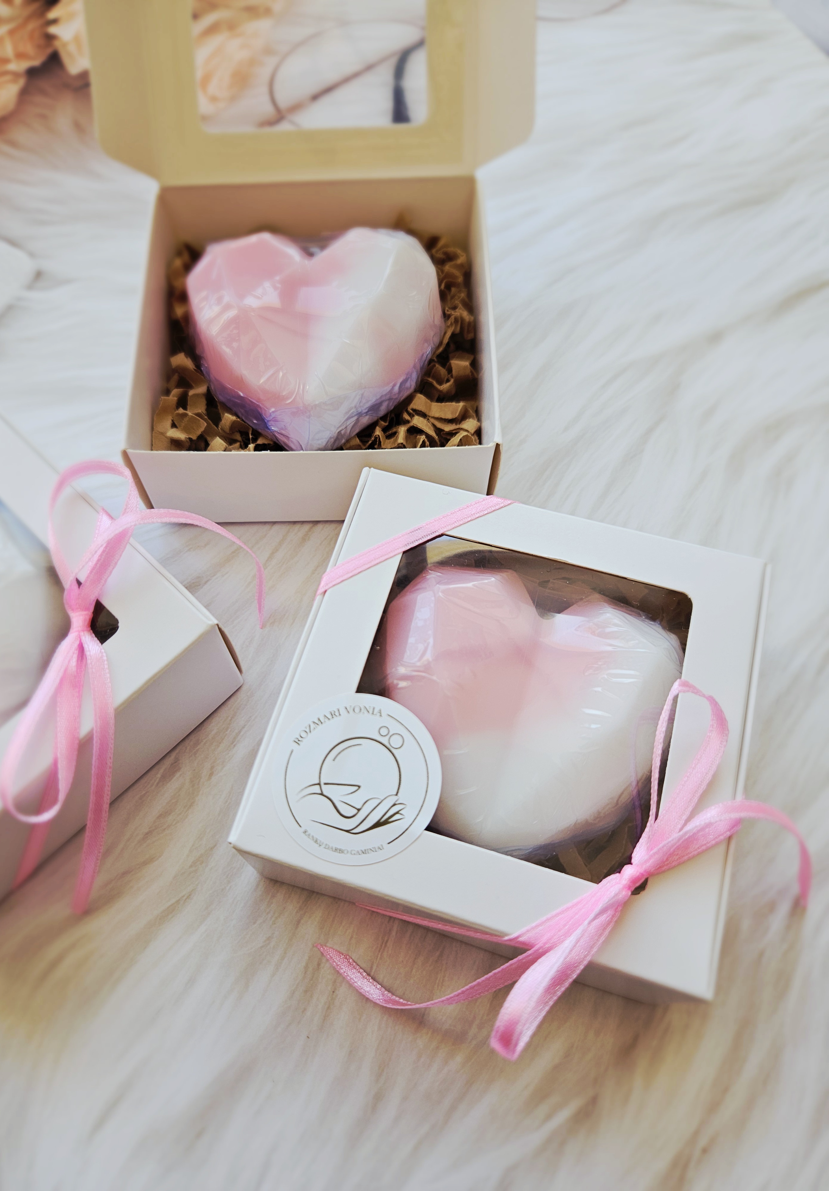 Muilas įdėtas į minimalistinę balto kartono dėžutę su langeliu ir perrištas atlasine juostele.