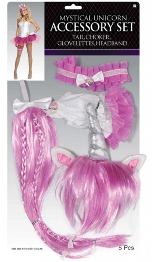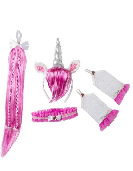 Rinkinį sudaro: lankelis su vienaragio ragu ir ausytėmis; prisegama rožinės spalvos uodega; rožinis keliaraištis; rankų aksesuarai su rožiniais akcentais.