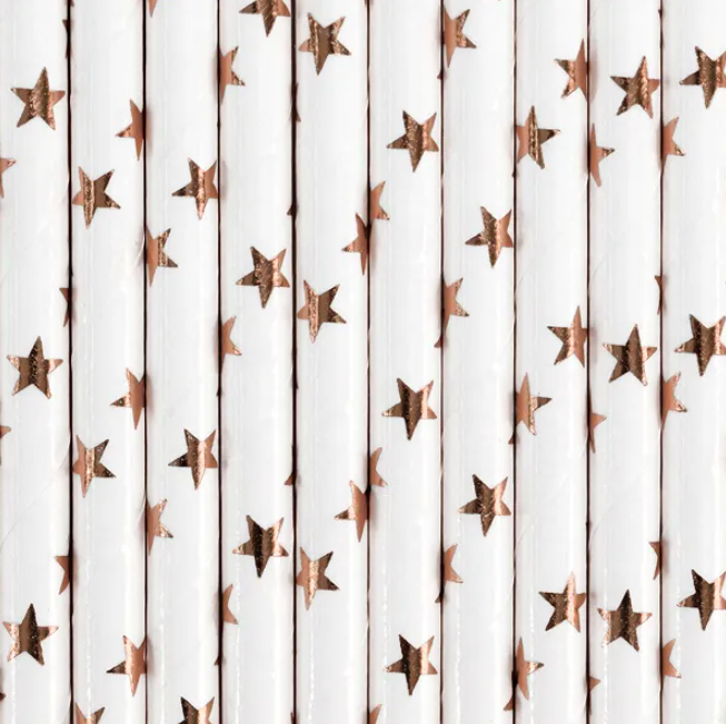 Šie prabangiai žaismingi popieriniai šiaudeliai, papuošti Rožinio aukso žvaigždutėmis - labai tinka įvairioms stalo dekoracijoms paruošti. Ypač gražiai atrodo permatomuose stikliniuose buteliukuose.