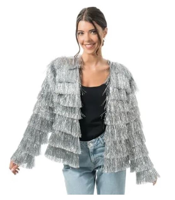 Švarkelis Sidabriniai kutosai – tai lengvas, žvilgantis ir itin stilingas drabužis, puikiai tinkantis vakarėliams, teminėms fotosesijoms ar šventiniams renginiams.
