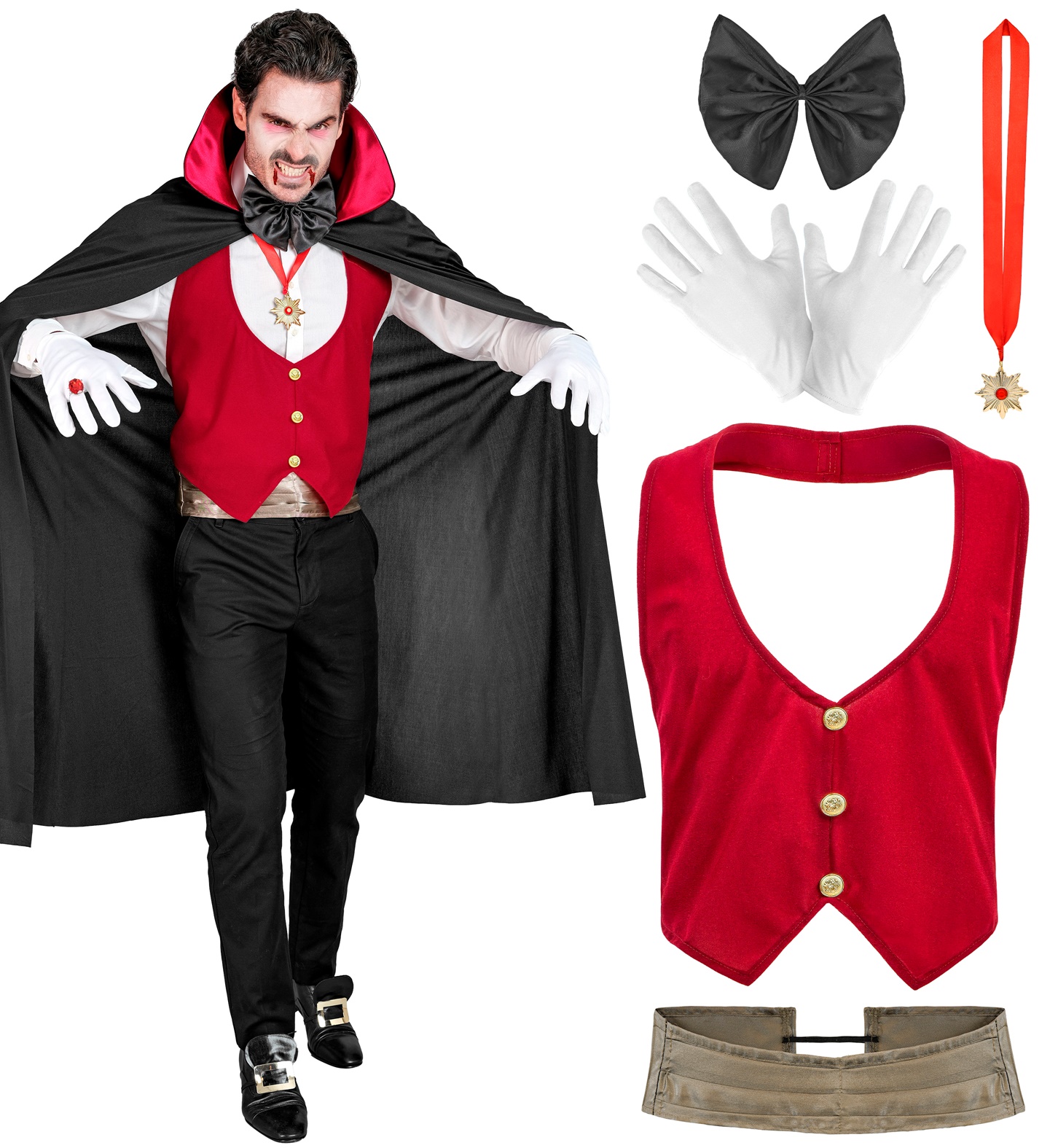 Vampyro apsiaustas su aksesuarais, kurie sukuria pilną ir įspūdingą įvaizdį: elegantiškas raudonos spalvos liemenė su auksinėmis sagomis, rudas atlasinis juosmens diržas, didelis, juodos spalvos kaspinas kaklui, dekoratyvinė grandinėlė su medalionu, baltos pirštinės bei juodas apsiaustas su raudonu apykaklės vidumi ir aukštu, standžiu apykaklės atvartų pakėlimu.