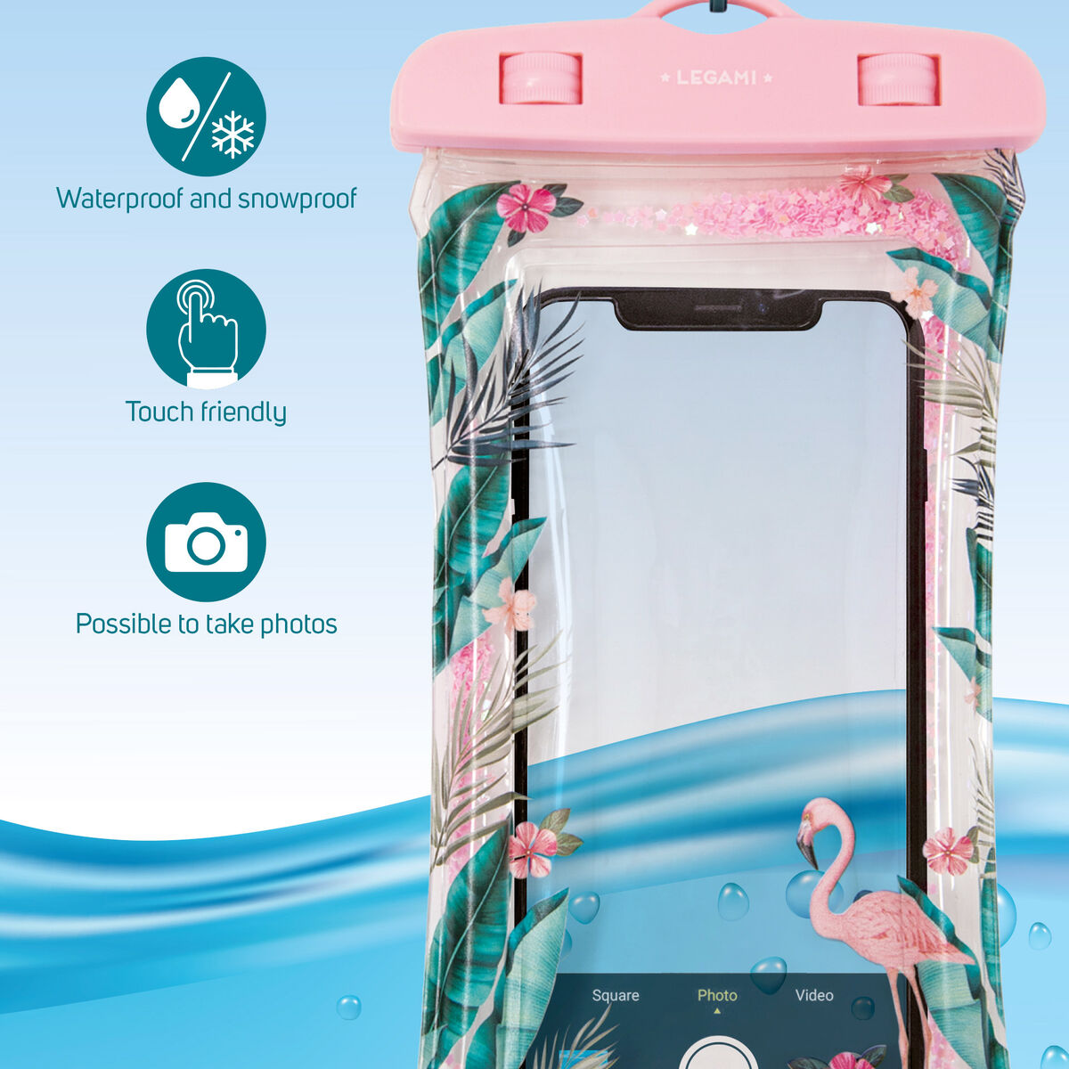 Vandeniui ir sniegui atsparus telefono dėklas su flamingais. Su šiuo dėklus galima naudotis telefonu ir fotografuoti.